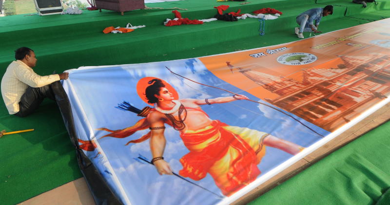 Indian workers prepare hoardings with pictures of Lord Rama on it ahead of a rally called Vishal Dharm Sabha to be held by Vishwa Hindu Parishad (VHP), in New Delhi.