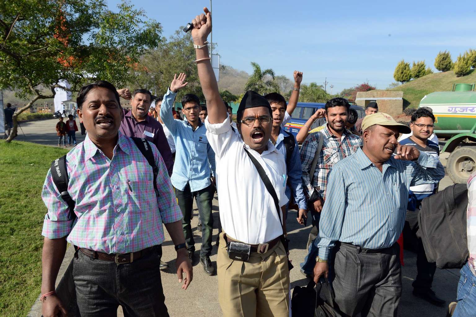 Volunteers from Rashtriya Swayamsevak Sangh (RSS) shouting slogans as they arrive for a rally in Pune on Jan 3, 2015.
