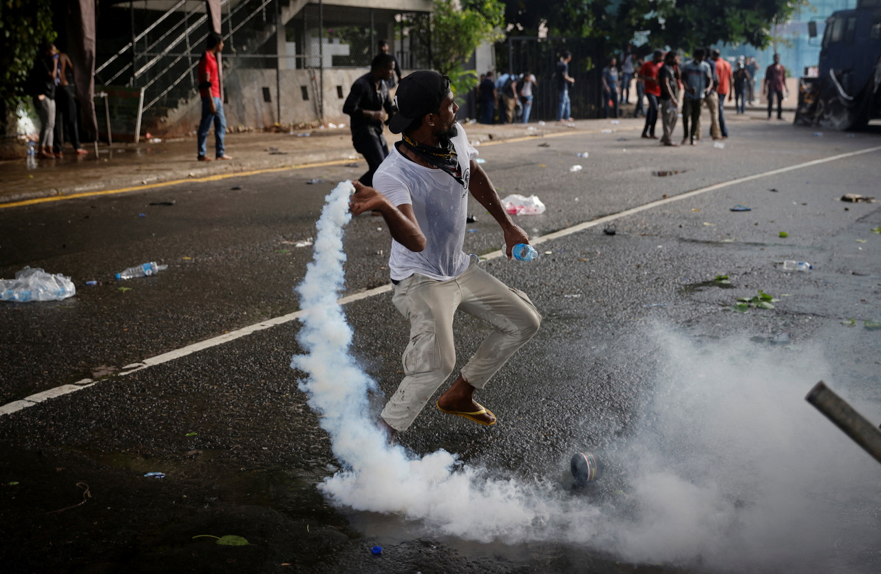 A protestor throws back a tear gas canister towards the police during a protest in Colombo on May 19, 2022.
