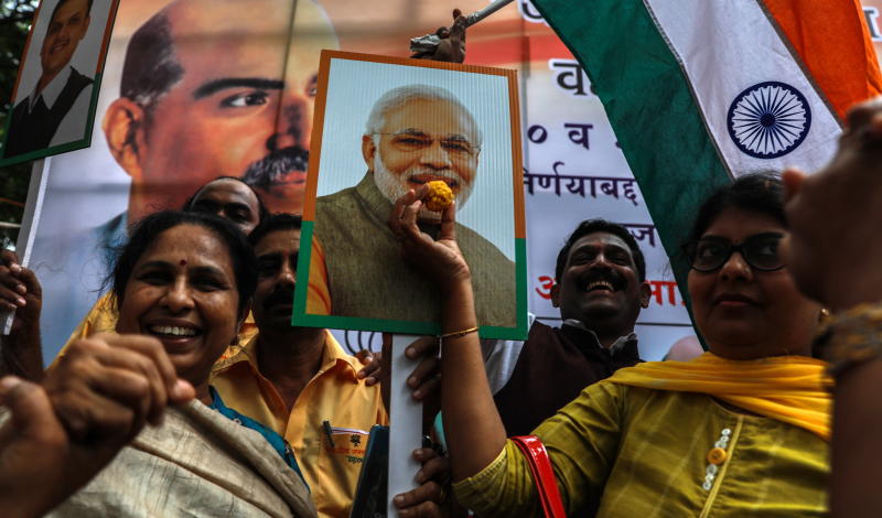 Indian Bharatiya Janata Party (BJP) supporters hold the national flag and poster of Indian Prime Minister Narendra Modi, shout slogans and distribute sweets as they celebrate the removal of Article 370, in Mumbai, India on Aug 6, 2019.