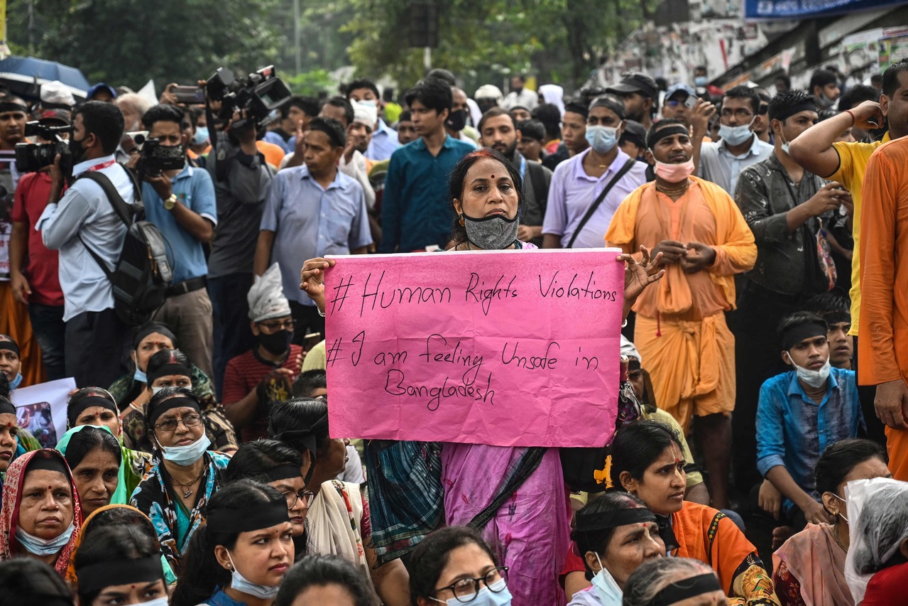 Bangladeshi Hindus stage a demonstration to protest against the religious violence against Hindus in Dhaka on Oct 18, 2021.