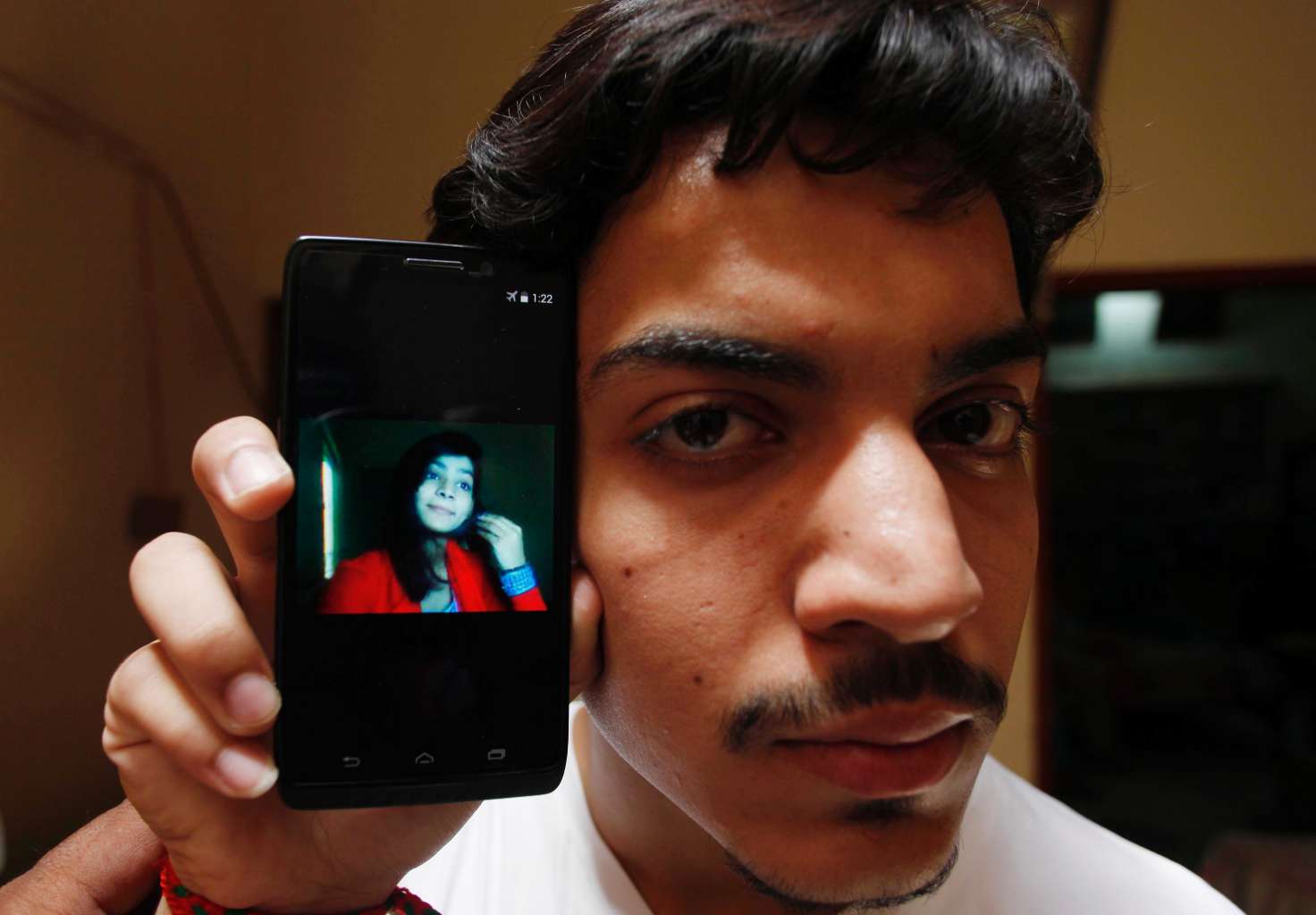 Hassan Khan shows the picture of his wife Zeenat Bibi, who was burnt alive by her mother, on his cellphone at his residence in Lahore on June 8, 2016.