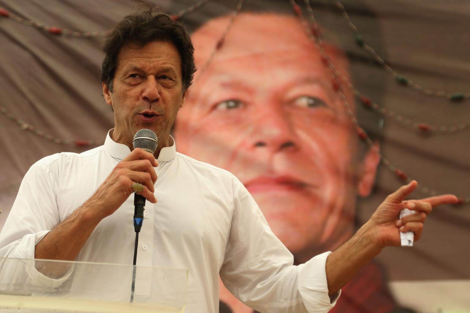 Imran Khan, head of political party Pakistan Pakistan Tehreek-e-Insaf, speaks to supporters as the country gears up for general elections, in Karachi, Pakistan, on July 4, 2018.