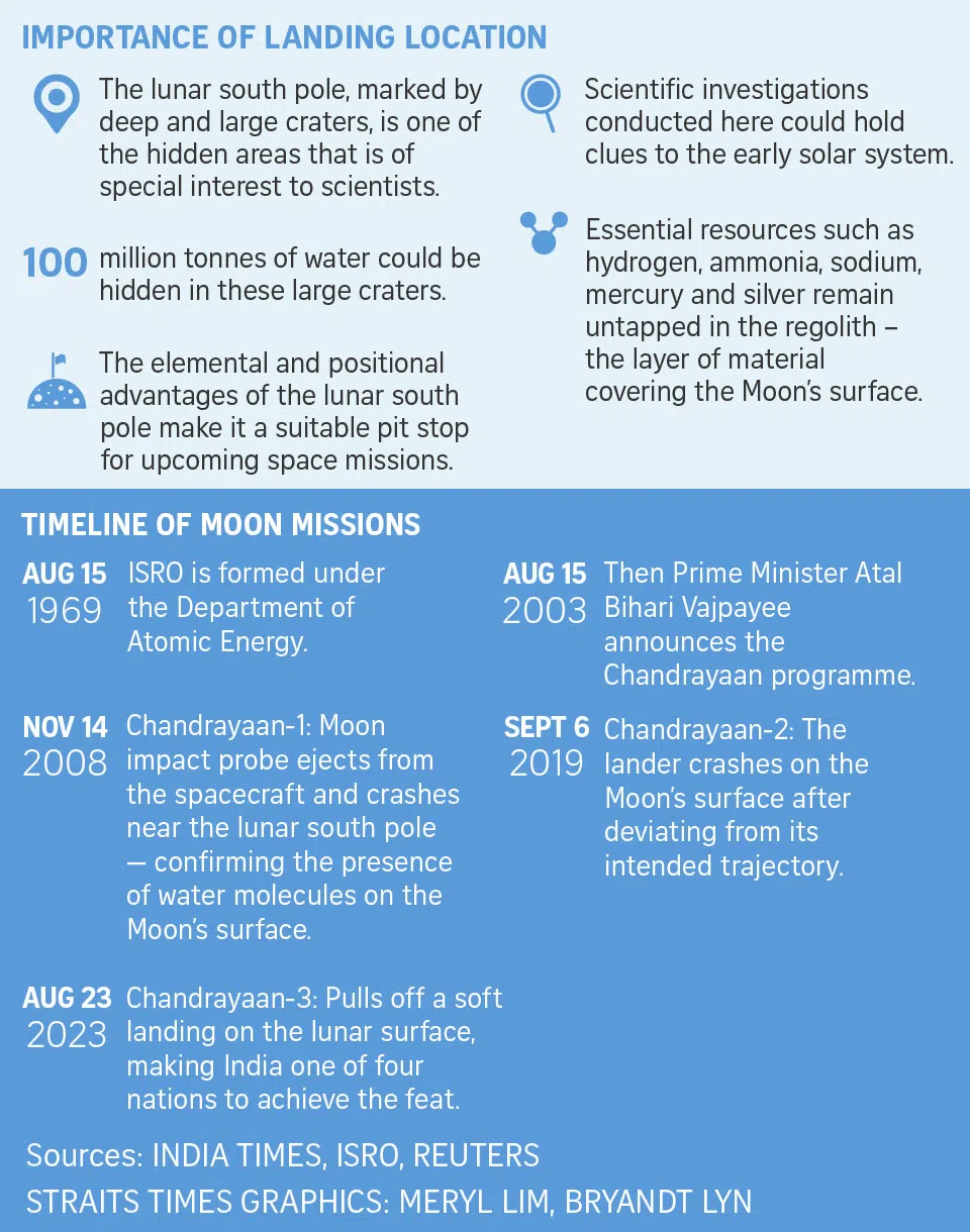 “Landing on the south pole (of the Moon) would actually allow India to explore if there is water ice on the Moon. And this is very important for cumulative data and science on the geology of the Moon,” said Ms Carla Filotico, a partner and managing director at consultancy SpaceTec Partners.