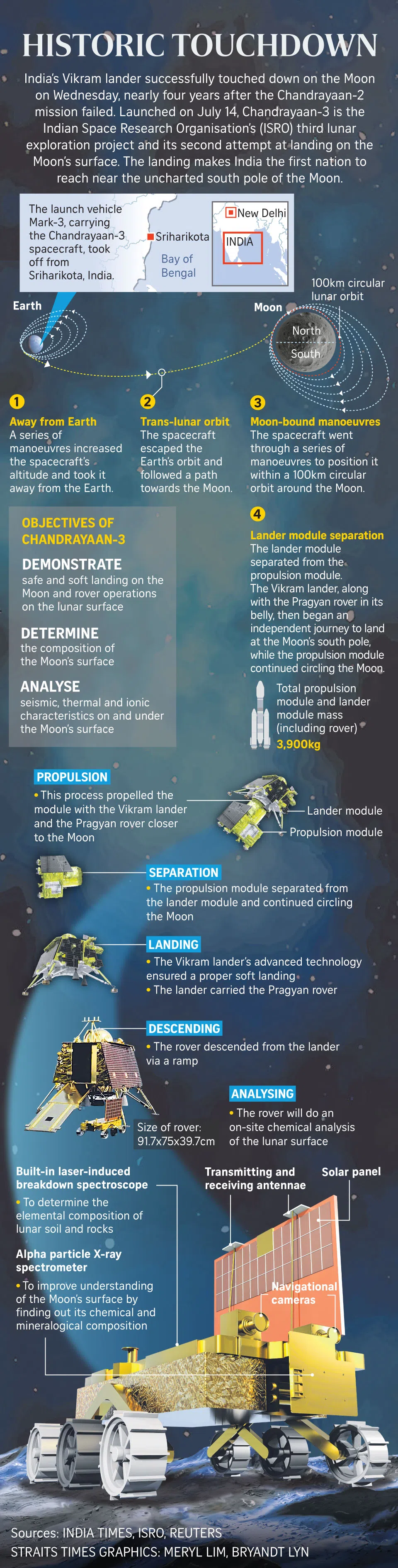 “India is on the Moon,” said Mr S Somanath, chief of the Indian Space Research Organisation (ISRO) as the Chandrayaan-3 spacecraft landed on the lunar south pole.