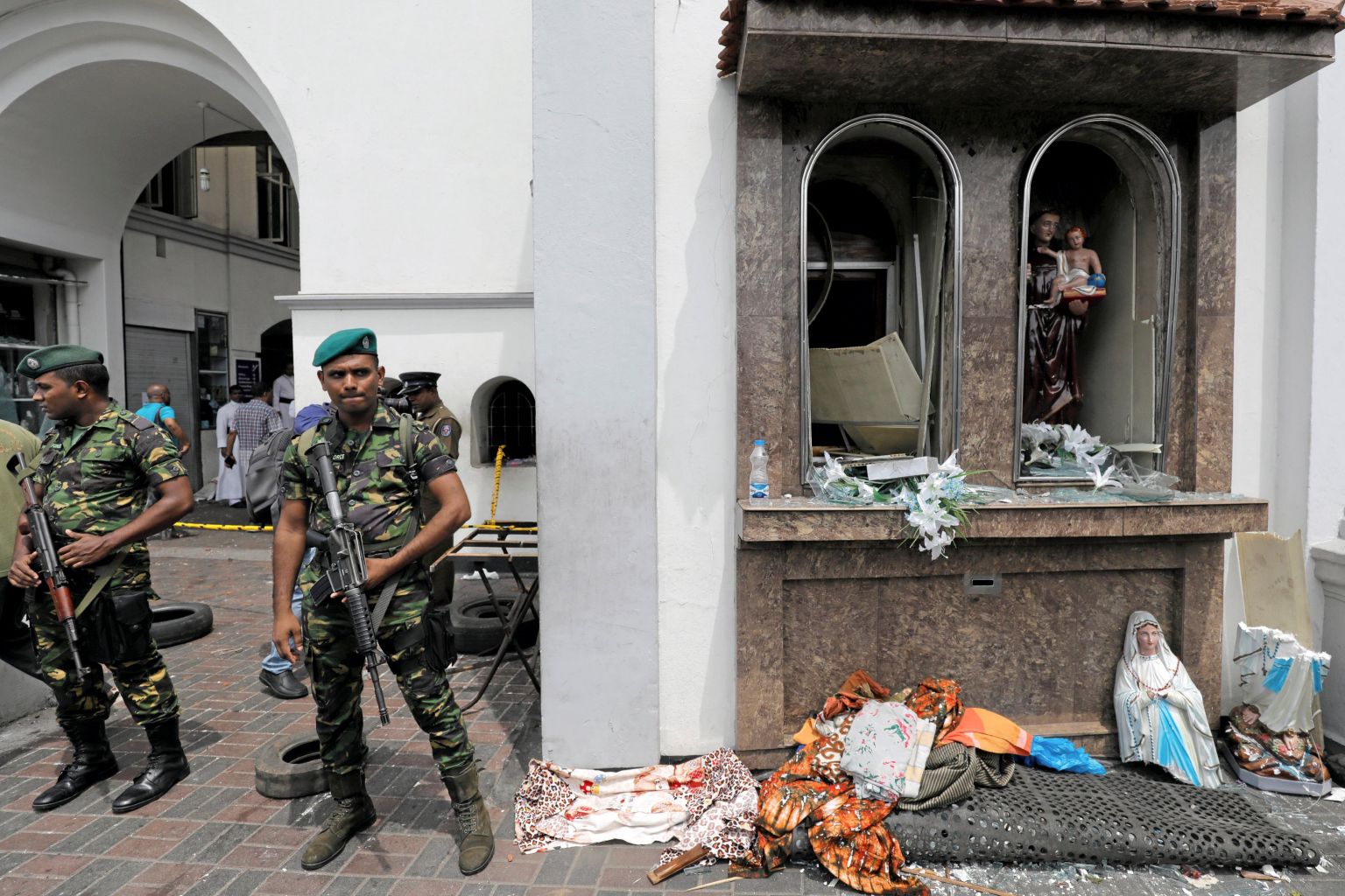 Sri Lankan military officials stand guard in front of St Anthony's Shrine following an explosion in Colombo, Sri Lanka, on April 21, 2019.