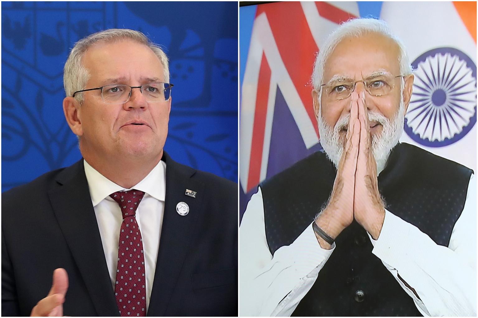 Australian PM Scott Morrison (left) and Indian PM Narendra Modi during a virtual leaders summit, on March 21, 2022.