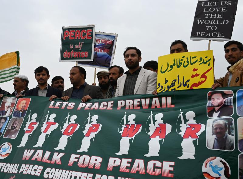 Pakistani activists carry placards during a peace rally in Islamabad on March 1, 2019.