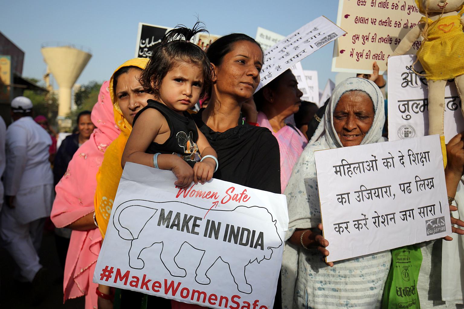 A girl and her mother attend a protest against rape cases in Surat, Gujarat, on April 18, 2018.