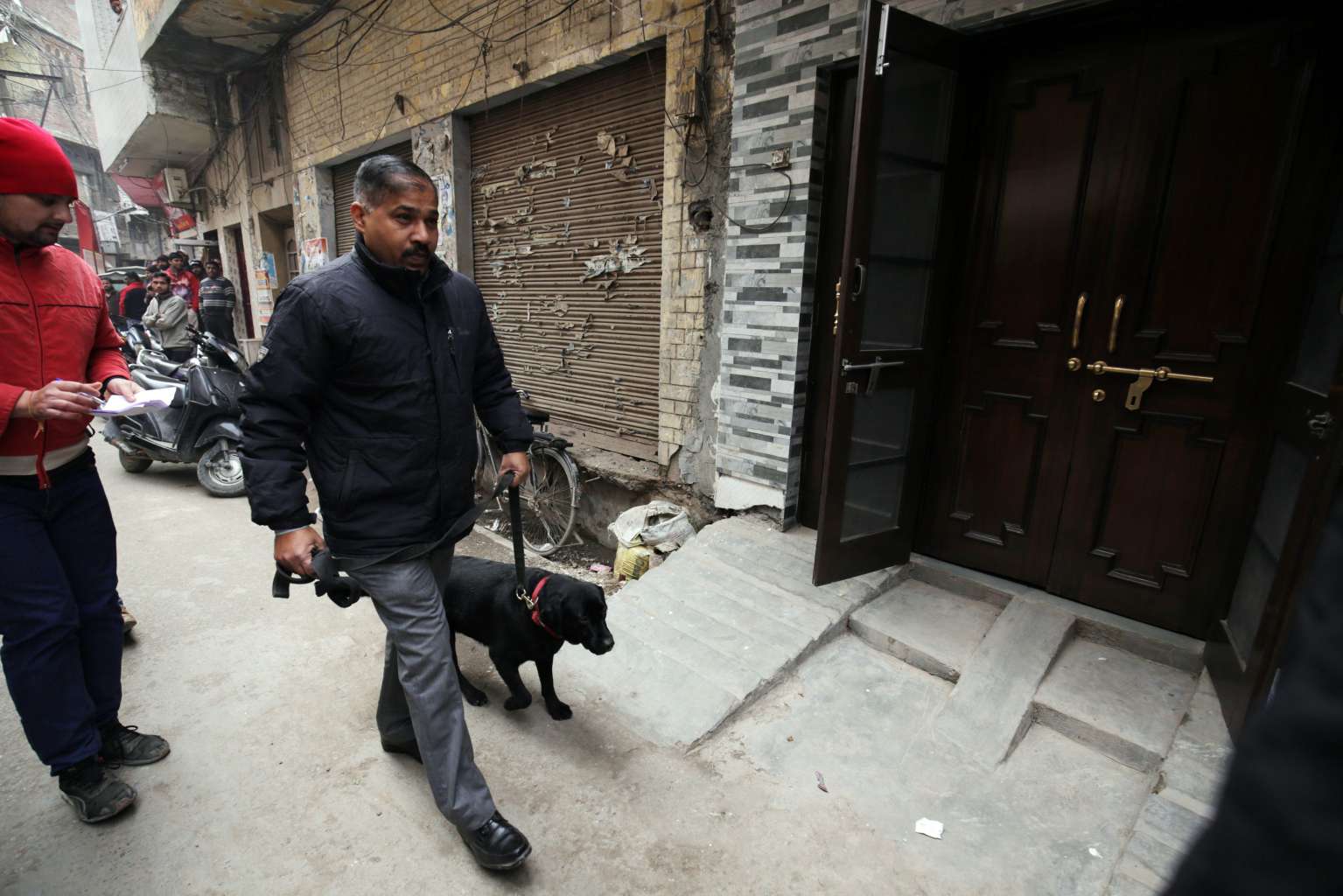 A National Investigation Agency (NIA) official with a sniffer dog arrives at a residence during a raid.