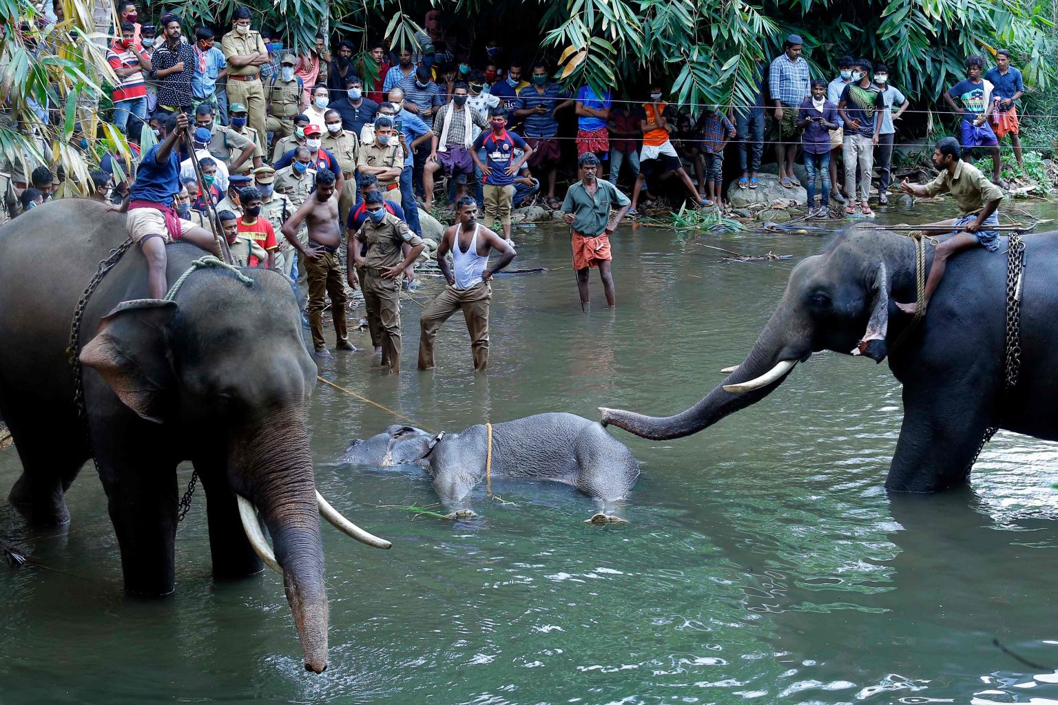 Policemen and onlookers stand near a dead pregnant wild elephant retrieved after it strayed into a village and ate an explosive-filled fruit in Kerala state.