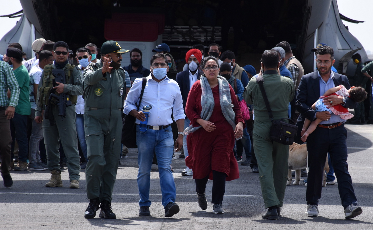 Indian people airlifted from Kabul, after Taleban took over the government, at Jamnagar airbase in Gujarat, India, on Aug 17, 2021.