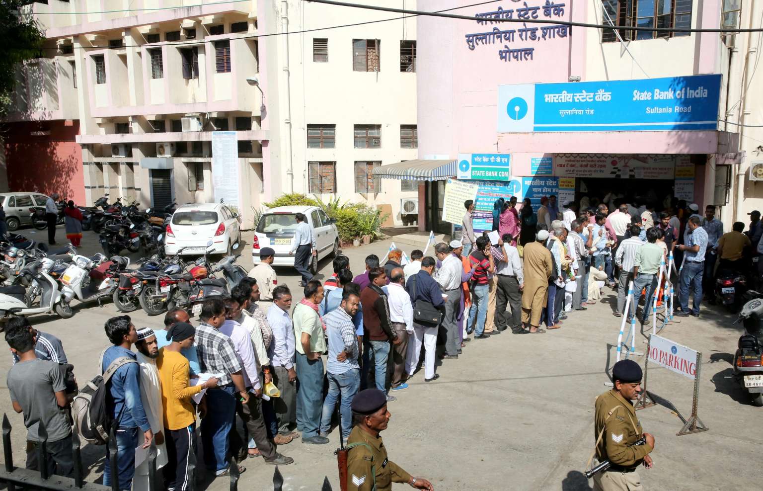 Twenty police stood outside a nearby outlet of the Reserve Bank of India, the central bank, letting in customers a few at a time.