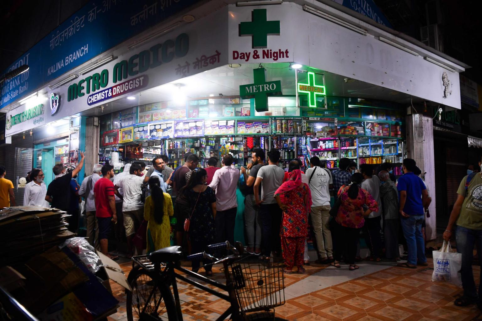 People gather at a pharmacy to buy supplies following the Indian Prime Minister's announcement of a government-imposed nationwide lockdown, in Mumbai on March 24, 2020.