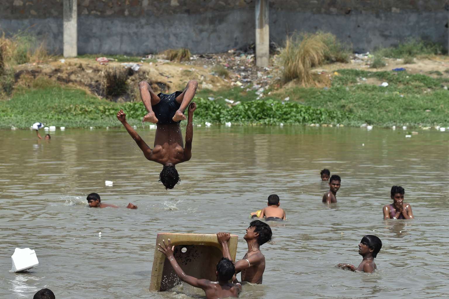 Indian children take a dip in a pond to escape the afternoon heat in New Delhi on May 22, 2016.