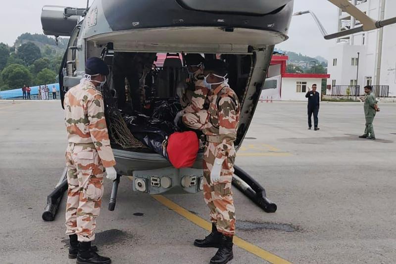 Indo-Tibetan Border Police personnel prepare to remove the bodies of mountaineers retrieved from Nanda Devi in the Himalayas, in Pithoragarh, India, on July 3, 2019.