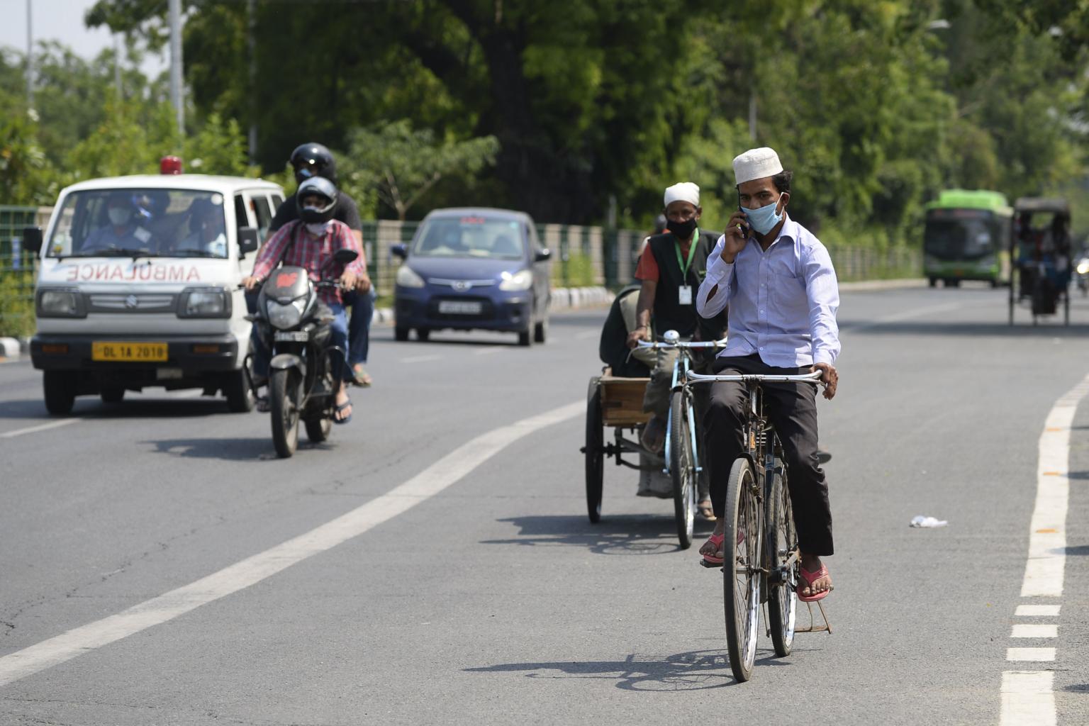 A man rides his bicycle as he speaks on his mobile phone in New Delhi on May 18, 2020.
