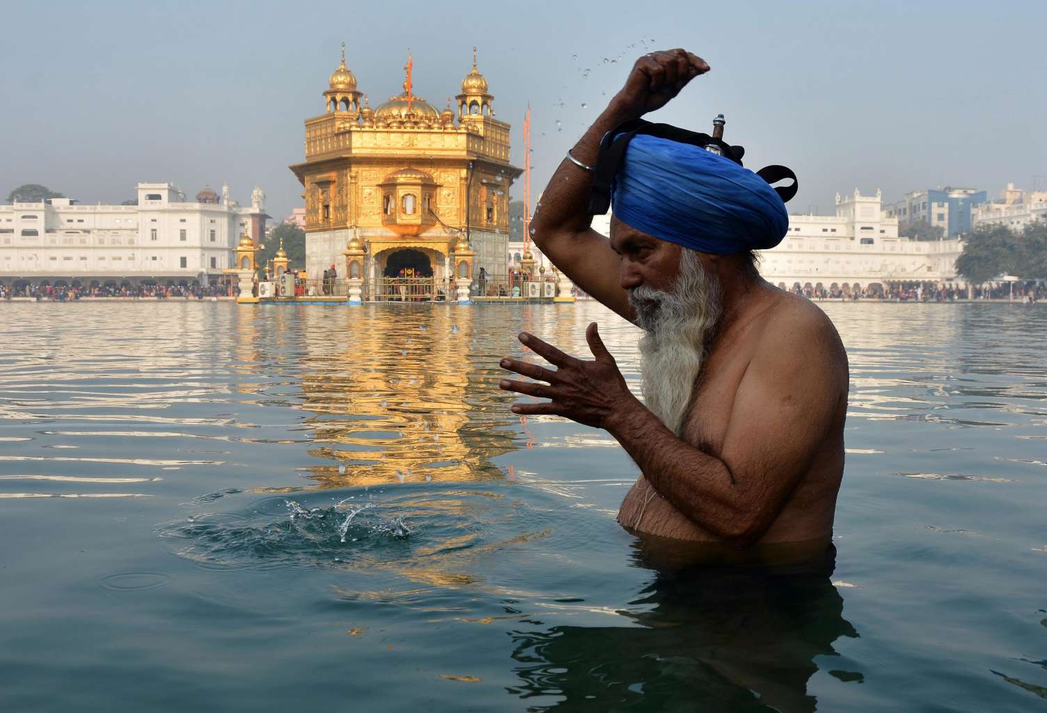 A Sikh man takes a holy dip in the sacred pond of the Golden Temple on the first morning of the new year in Amritsar, India, on Sunday.