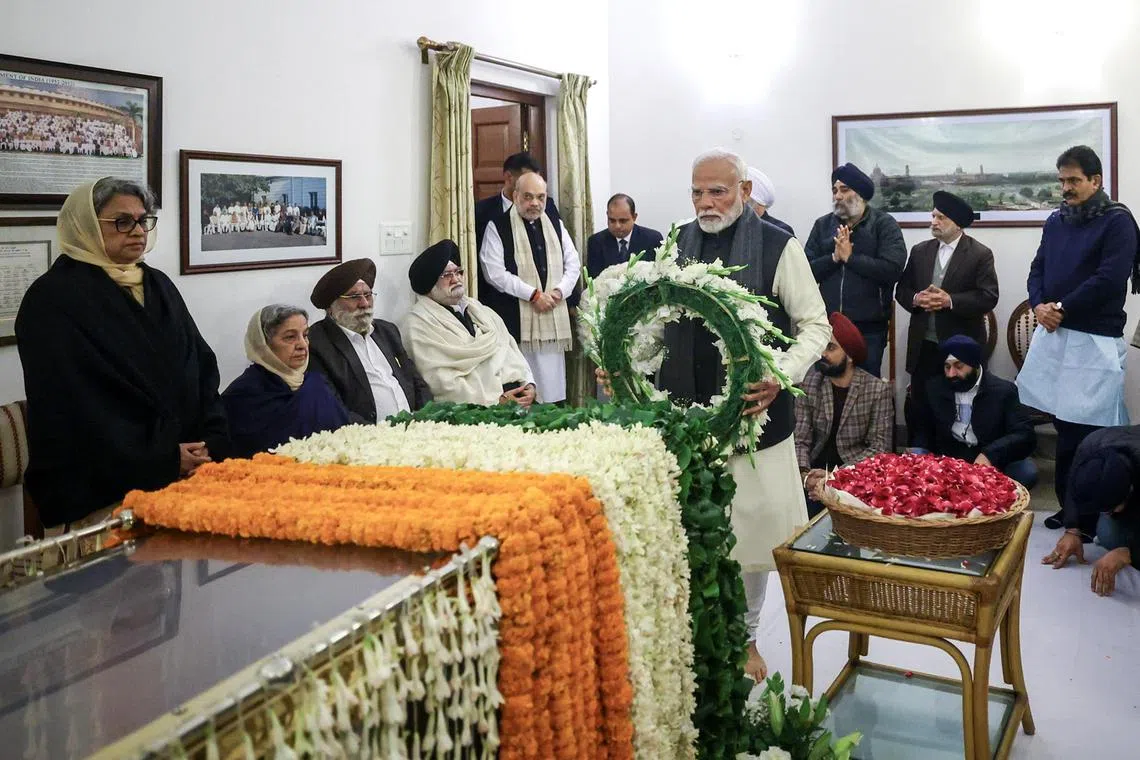 Indian Prime Minister Narendra Modi (centre) laying a wreath as he pays his respects to later former prime minister Manmohan Singh, in New Delhi, on Dec 27.