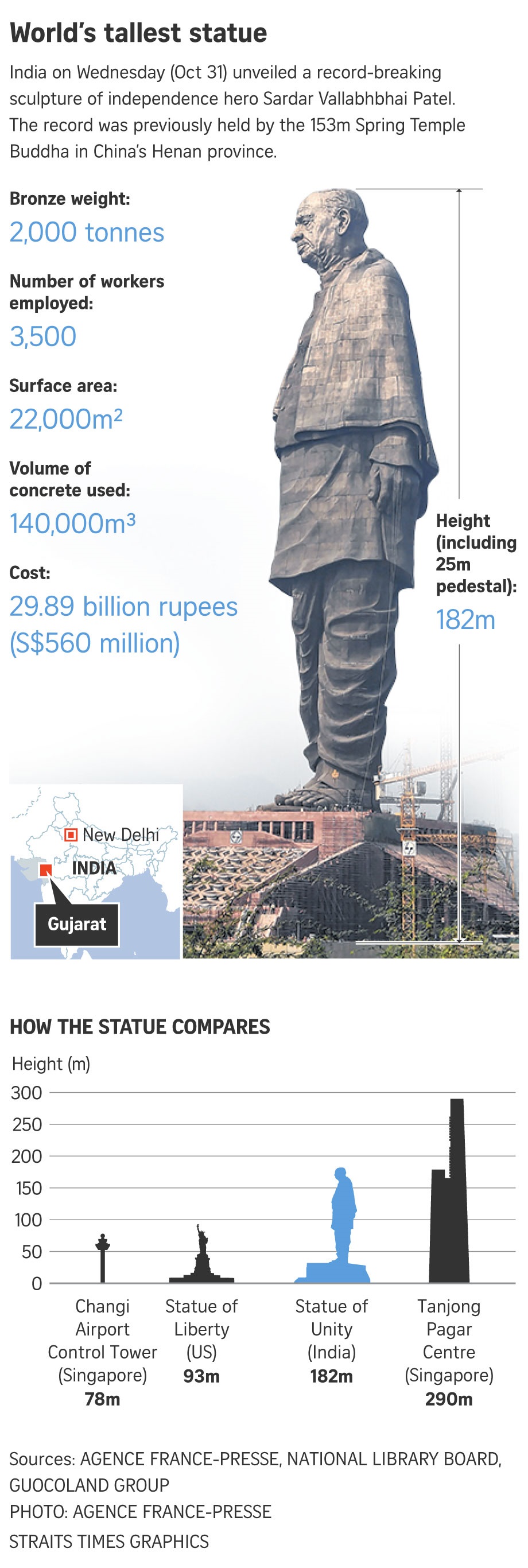 It is made up of nearly 100,000 tonnes of concrete and steel. Online booking to visit the Statue of Unity has opened with a 350 rupee (S$6.55) admission fee for the 153m-high observation deck.