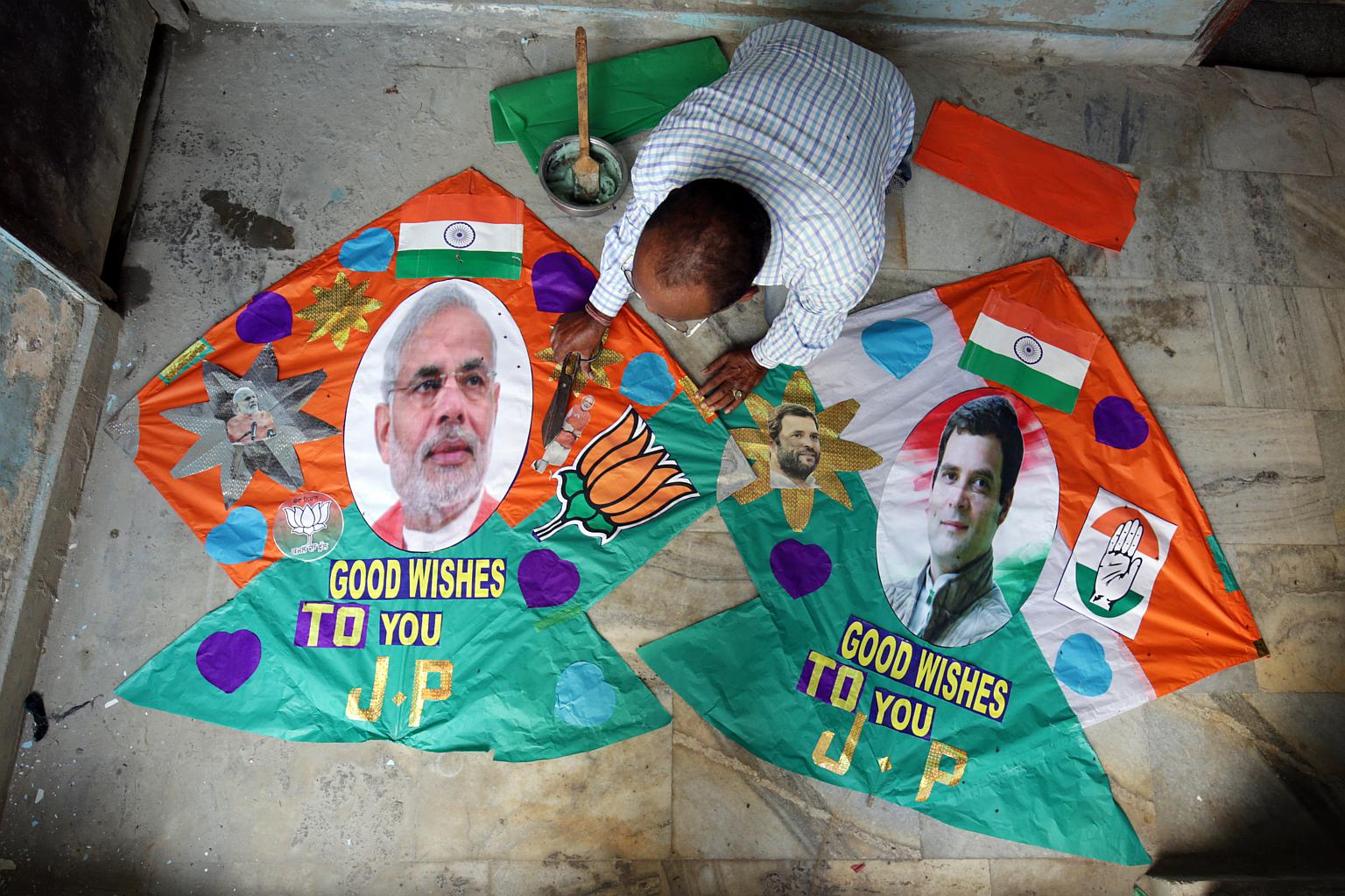 An Indian kite maker displays his specially made kites with pictures of Indian Prime Minister Narendra Modi (left) and Congress president Rahul Gandhi printed on them, in Amritsar, India, on May 22, 2019.