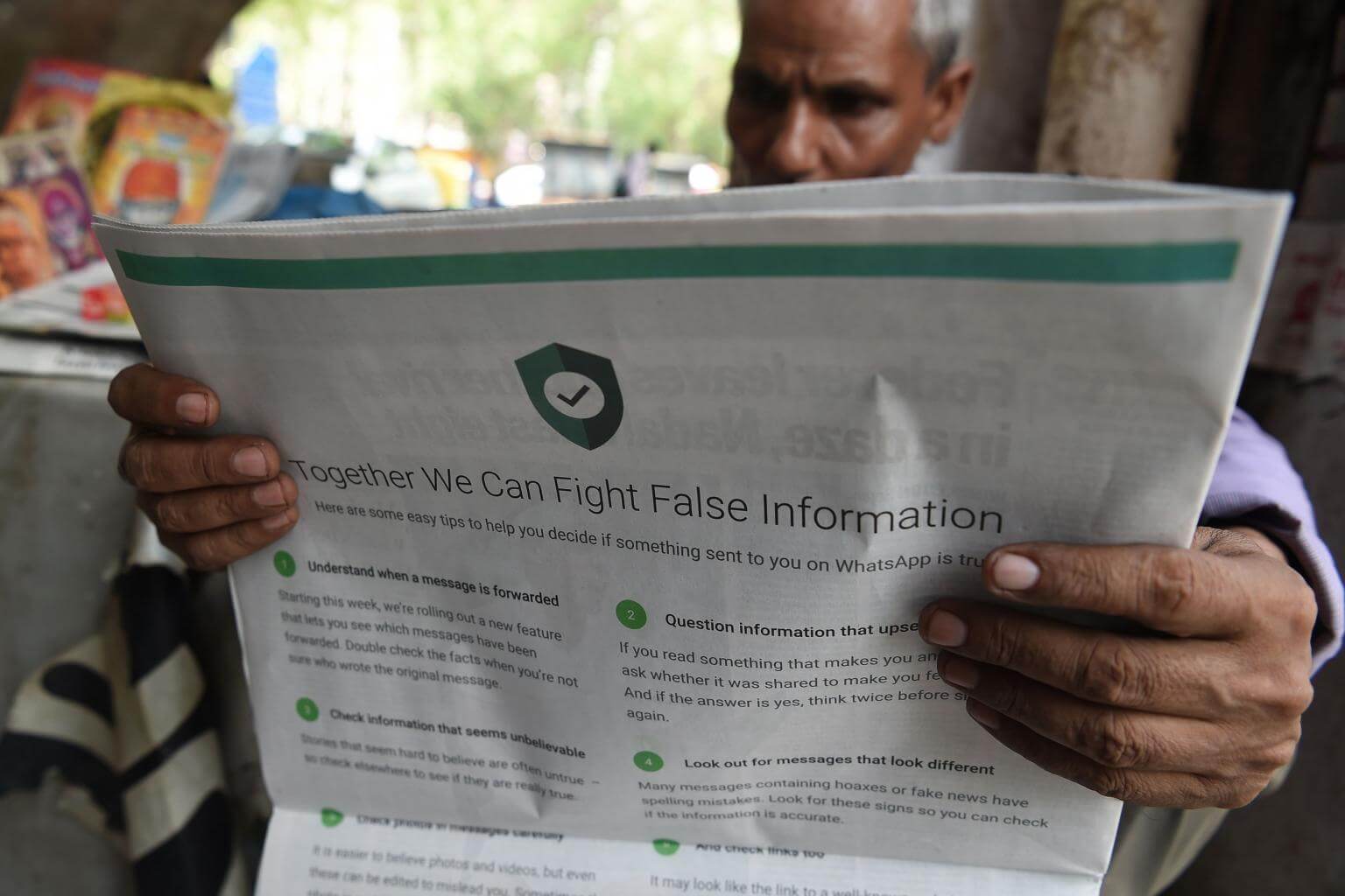 A man reads a newspaper with a full back page advertisement from WhatsApp intended to counter fake information, in New Delhi, on July 10, 2018.