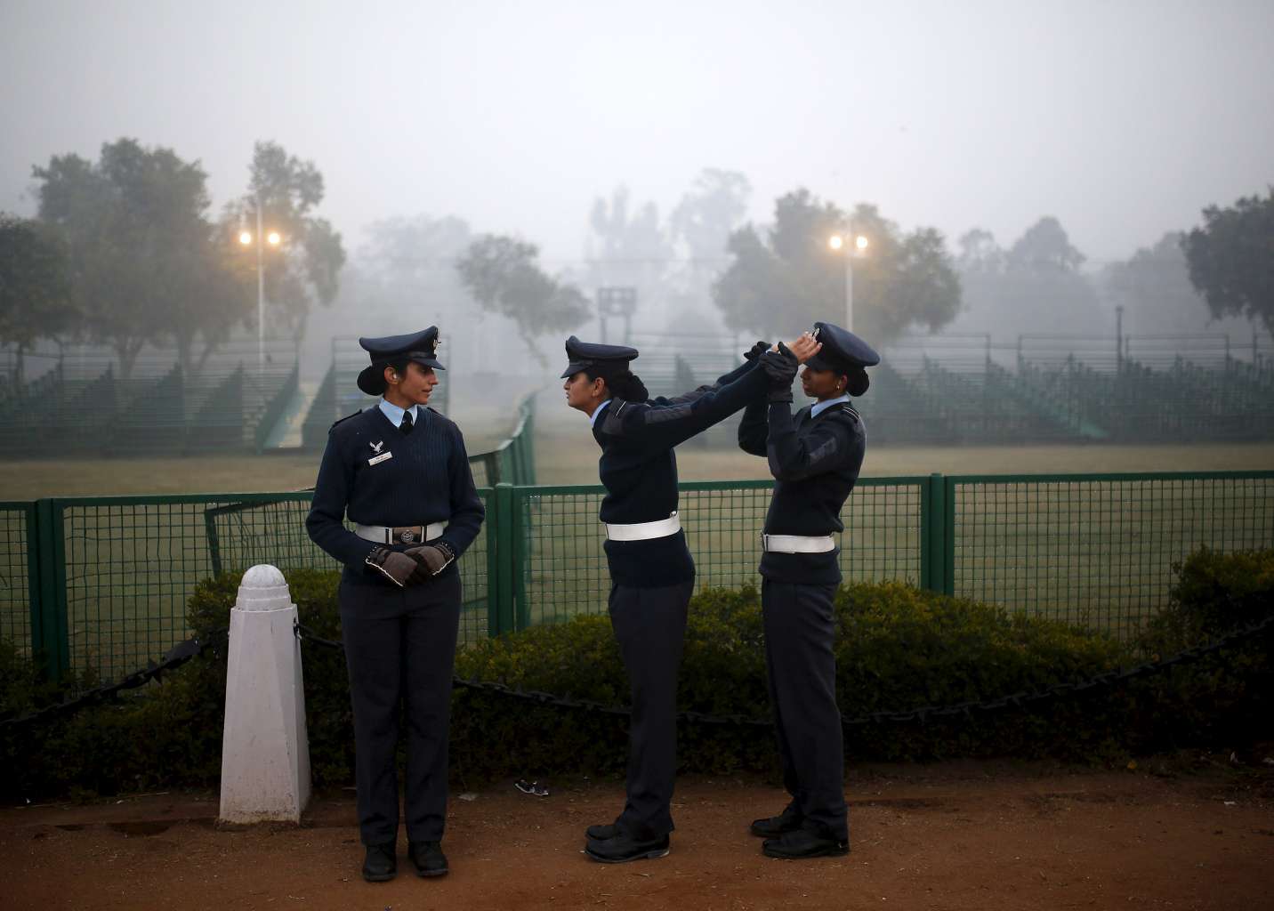 An Indian Air Force soldier (Right) stretches the arms of her colleague during the rehearsal for the Republic Day parade.