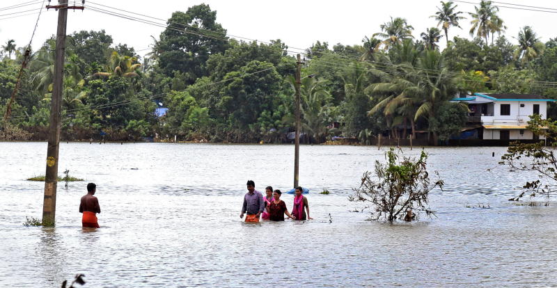 People wade through flooded water in Karinganthurthu Paravur Ernakulam Kochi Kerala, India, on Aug 20, 2018.