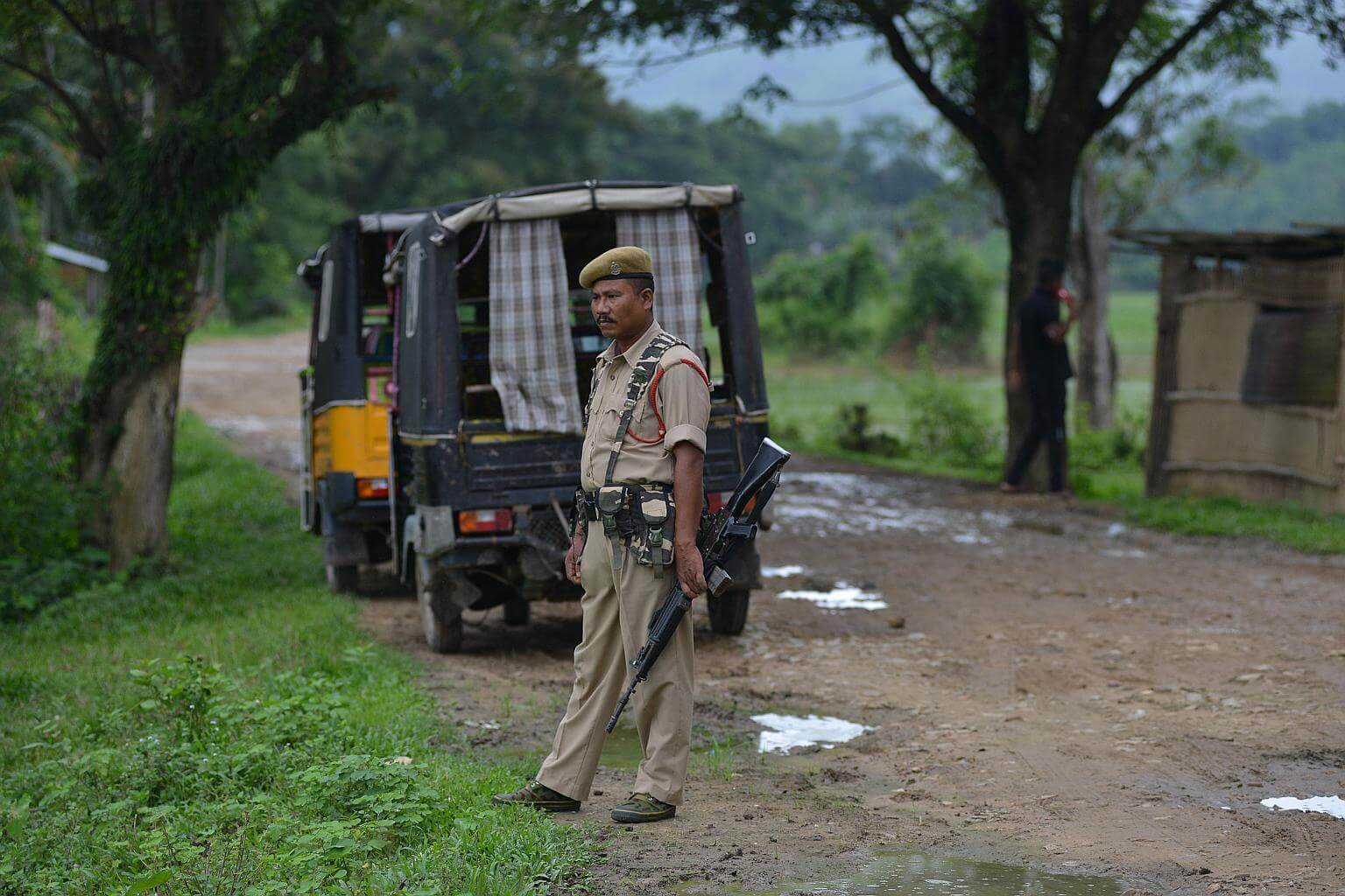 Security personnel near the site of the lynching of two men in Assam, India, on July 10, 2018. They were beaten to death by a mob after rumours of them being child abductors were circulated on WhatsApp.