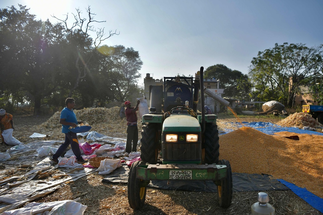 Farmers thresh their harvest of maize using a thresher machine at a farm on the outskirts of Bangalore on Jan 19, 2021.