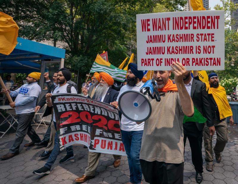 Sikhs for Justice members march during a rally near the United Nations headquarters in New York on India's Independence Day, on Aug 15, 2019.