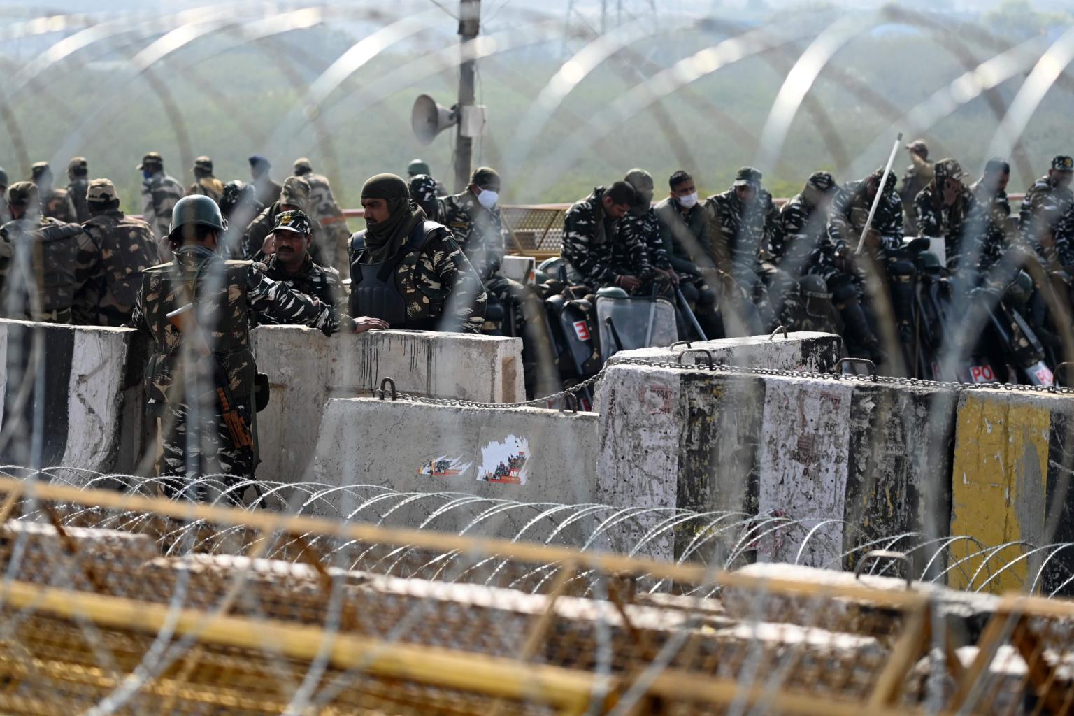 Security personnel keep watch behind barricades and barbed wire at the Delhi-Uttar Pradesh state border on Jan 30, 2021.