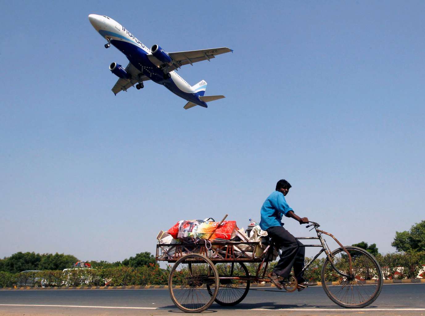 An IndiGo Airlines aircraft prepares to land as a man paddles his cycle rickshaw in Ahmedabad, India on October 26, 2015.