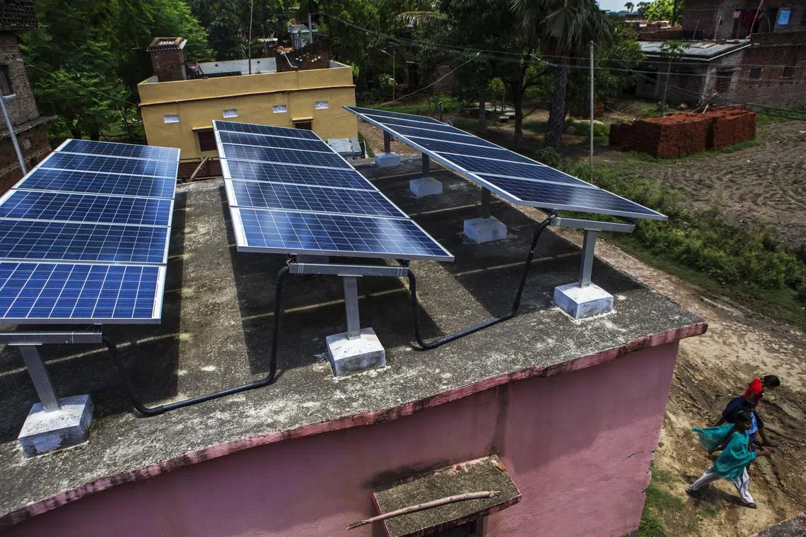 Solar panels mounted on the roof of a building as part of a solar power microgrid in the village of Dharnai in Jehanabad in India’s Bihar state.