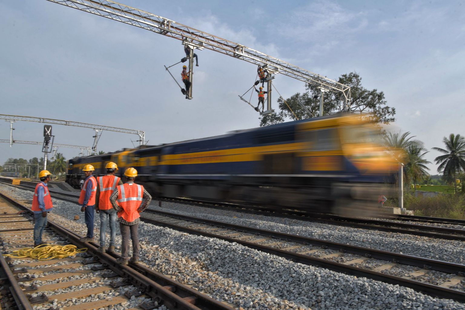 Workers erecting infrastructure for drawing electric cable lines over railway tracks for use by locomotives on the outskirts of Bangalore in January.