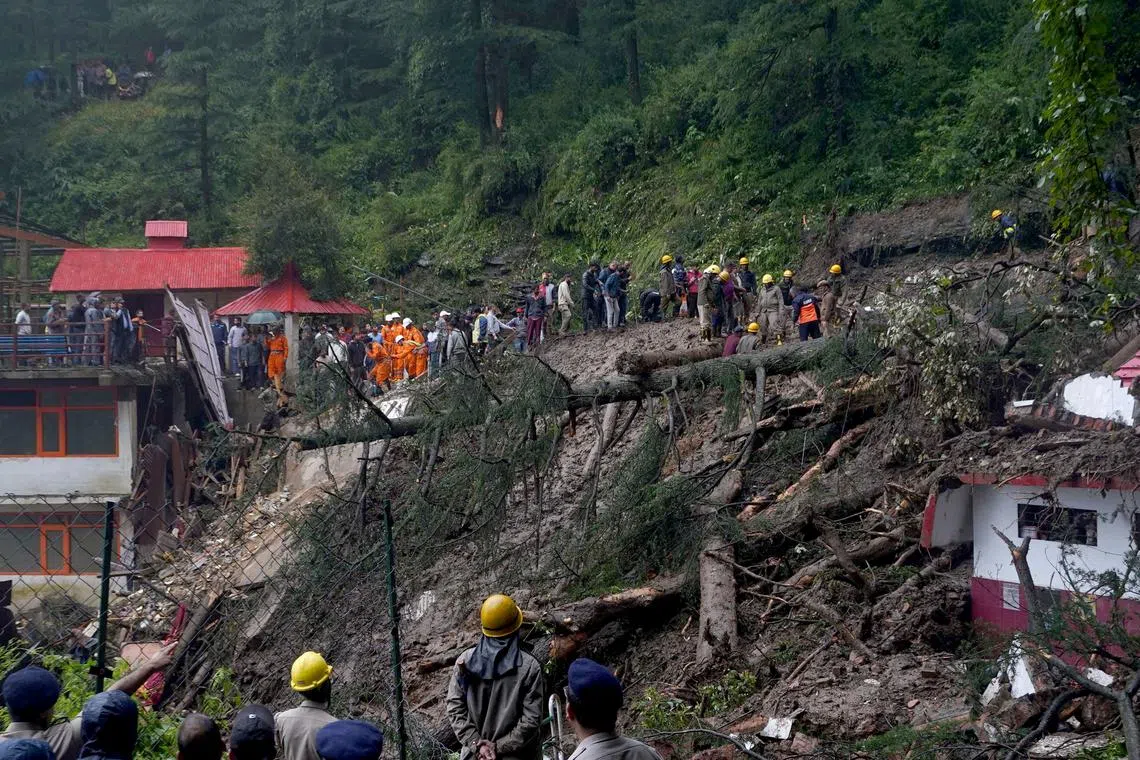 Rescue workers remove the debris as they search for survivors after a landslide following torrential rain in Shimla in the northern state of Himachal Pradesh, India, on Aug 14, 2023.