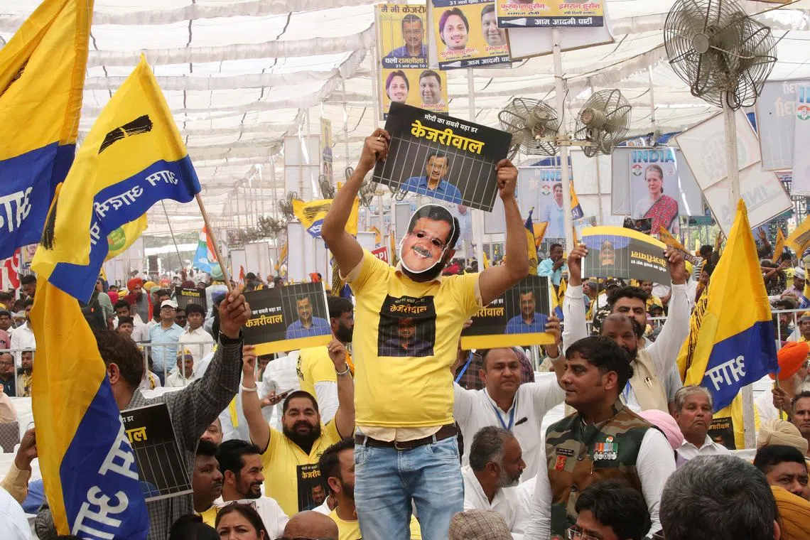Supporters of Delhi Chief Minister Arvind Kejriwal protesting against his arrest at a rally in New Delhi on March 31.