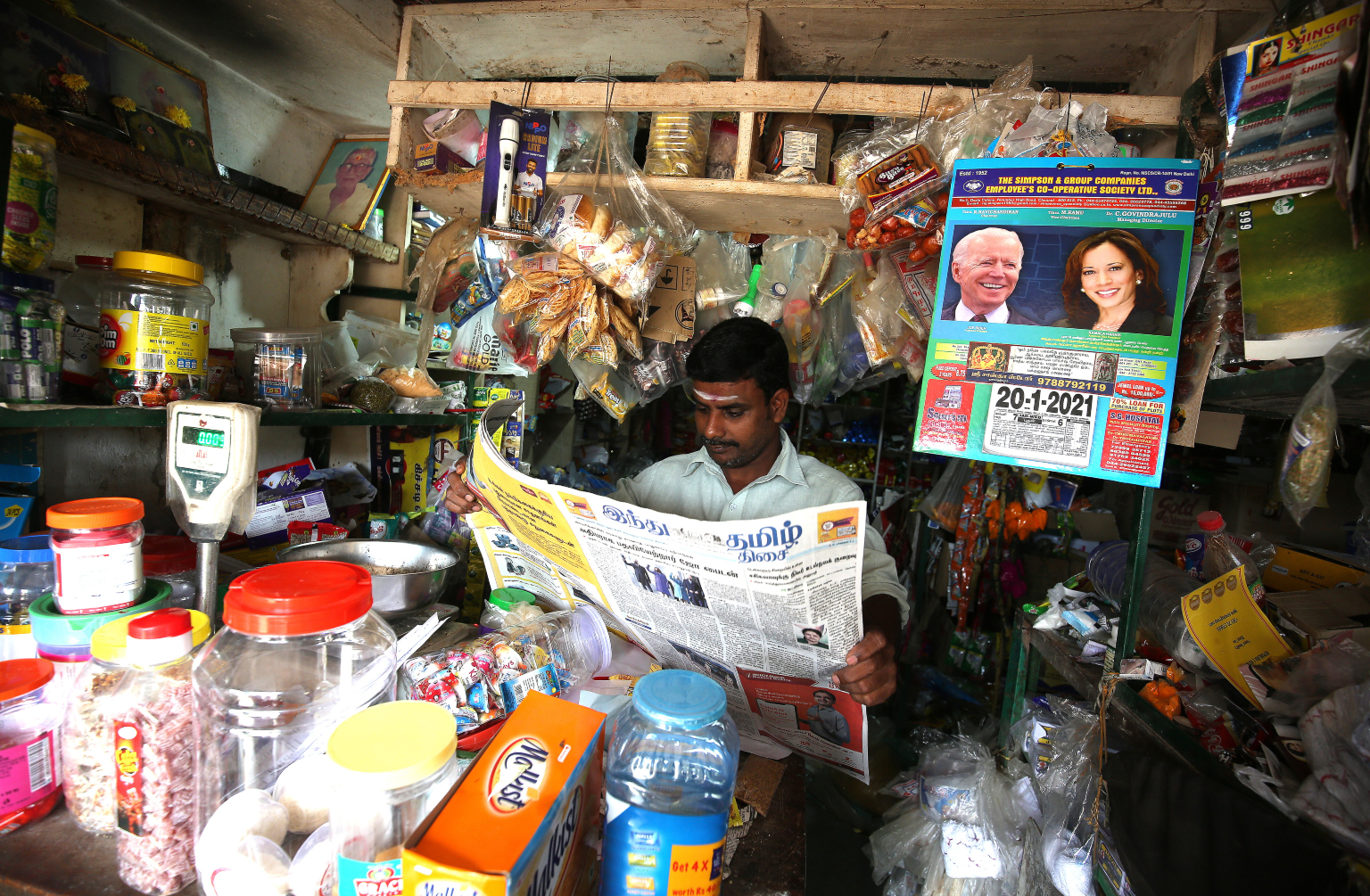 A calendar with the images of US President Joe Biden and Vice-President Kamala Harris in a shop in Thulasendrapuram, a village in the Indian state of Tamil Nadu. Ms Harris’ late grandfather P.V. Gopalan was from the village.