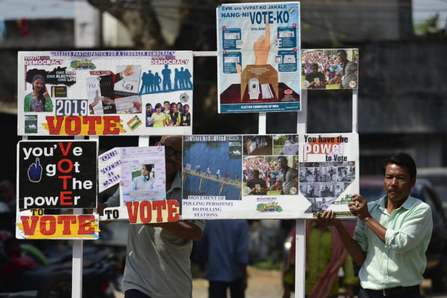 Indian election officials carry election information material during a voters’ awareness campaign in Tura, India. Authorities have confiscated 4.4 million litres of liquor and 1.5 billion rupees in cash considered suspicious so far, the election commission said in a statement.