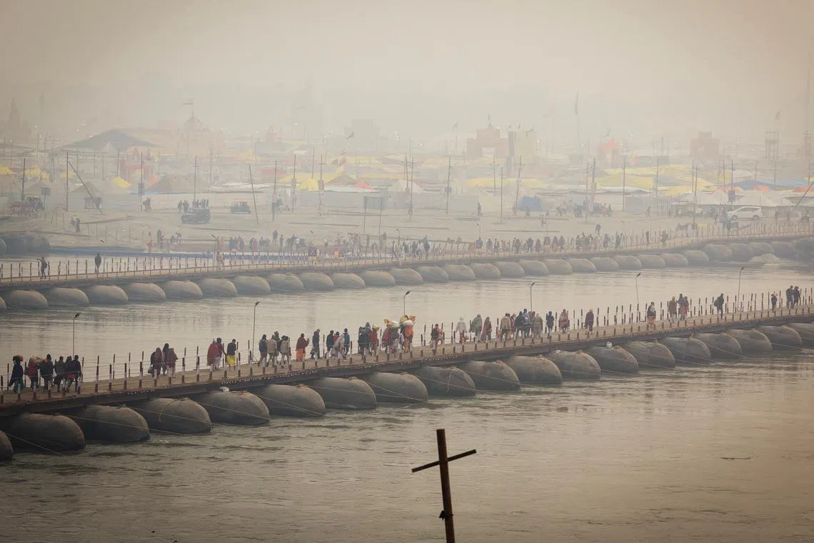 Hindu devotees crossing a pontoon bridge spanning the river Ganga as they arrive to attend the Maha Kumbh Mela in Prayagraj, on Jan 12.