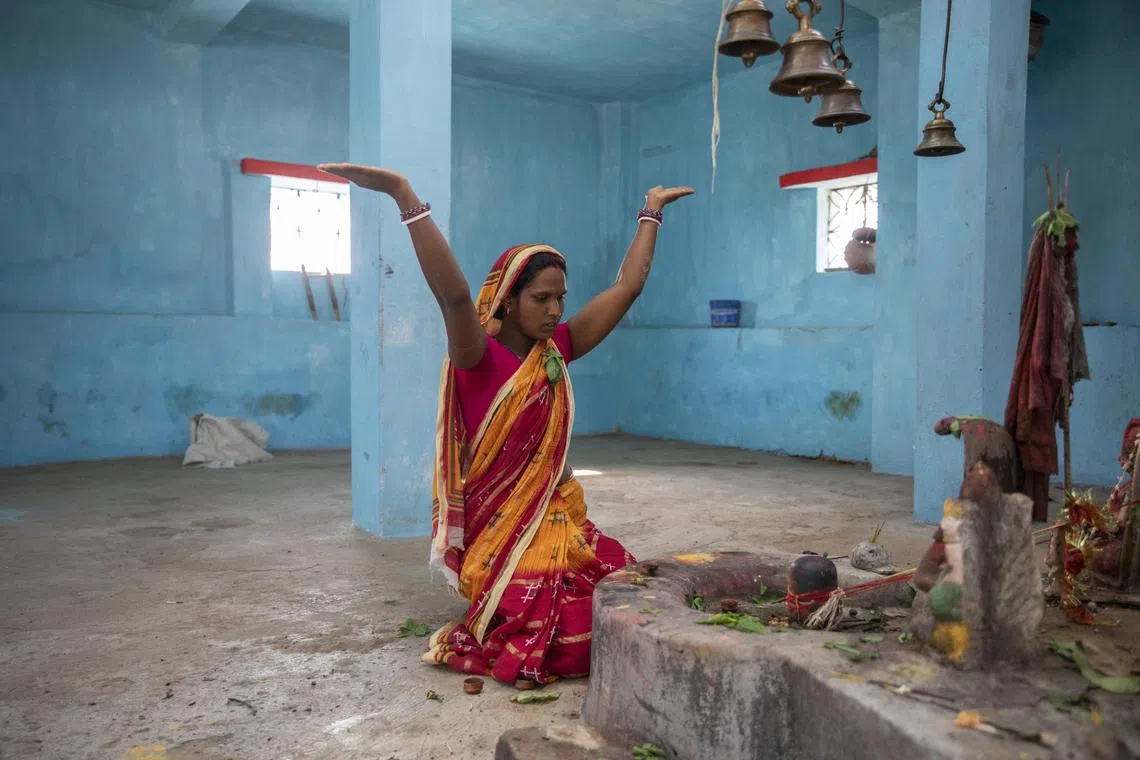 Ms Durga Mahato in the temple near where she was dumped unconscious, after being beaten and accused of being a witch, in a village in the eastern state of Jharkhand, India.