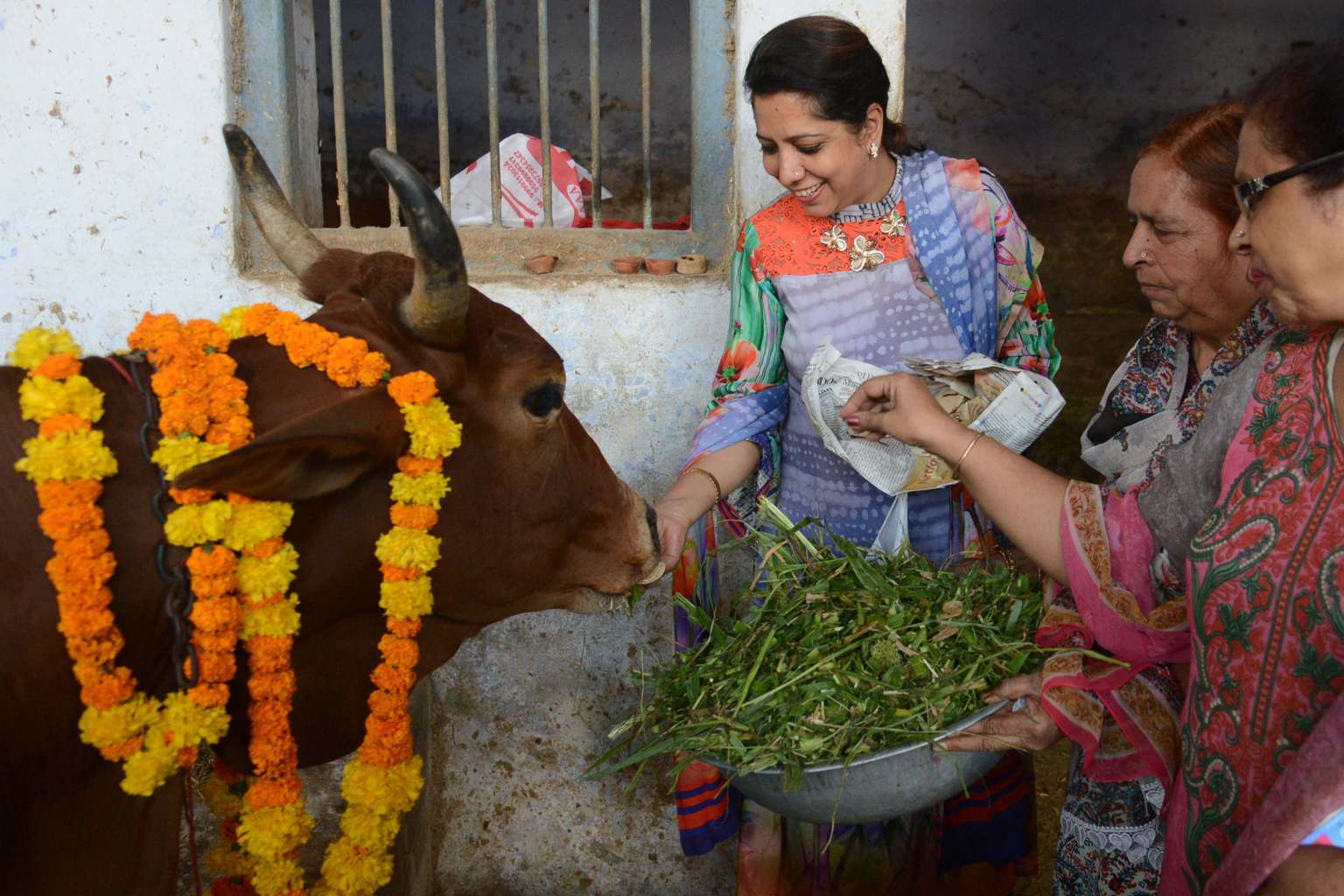 Indian devotees offer food to a cow during Gai Puja (cow worship) as part of the Gopal Ashtami festival.