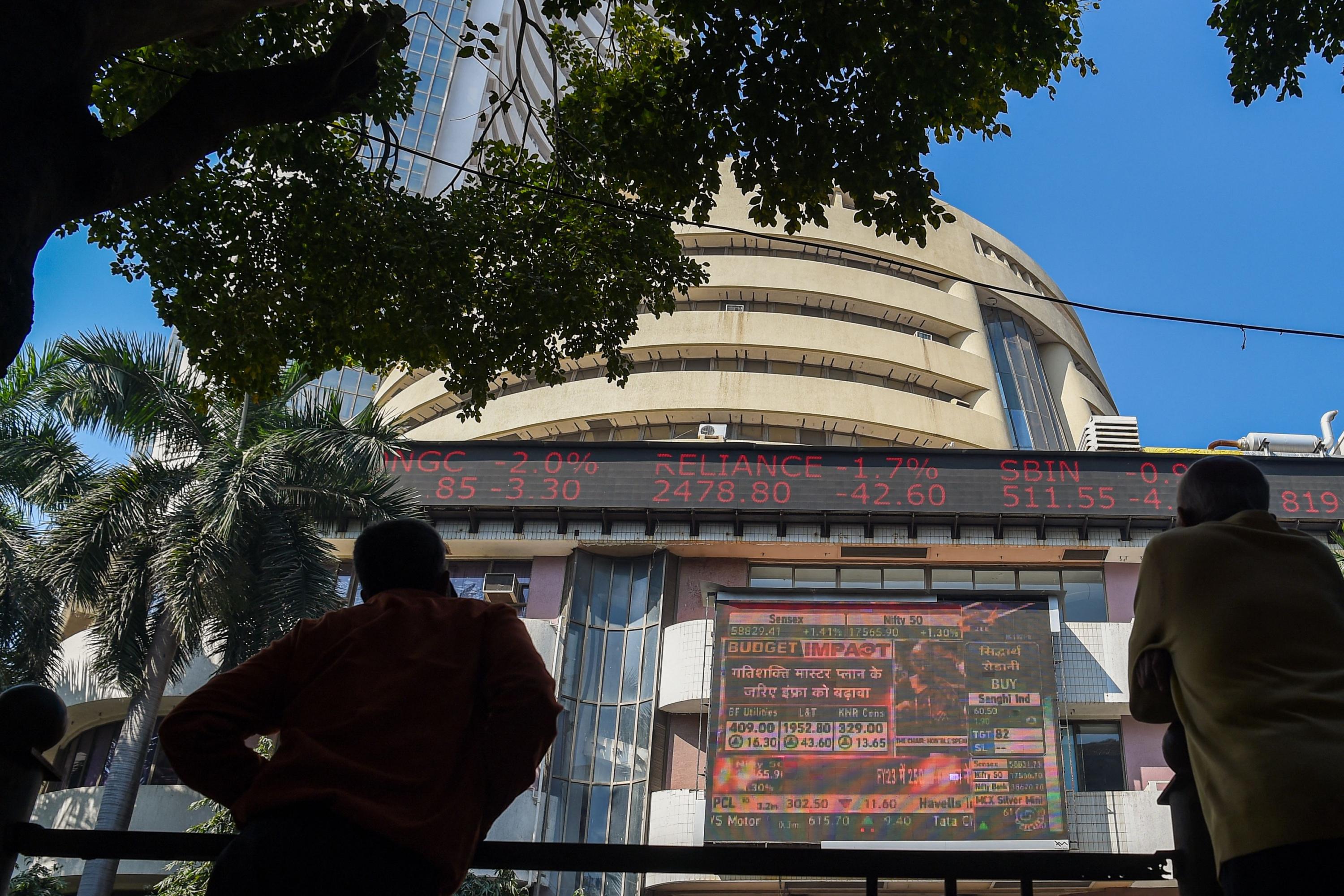 Pedestrians watch a screen relaying the budget speech on the facade of the Bombay Stock Exchange in Mumbai on Feb 1, 2022.