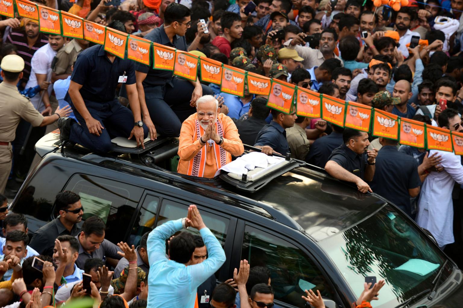 Indian PM and leader of the Bharatiya Janata Party (BJP) Narendra Modi (centre) gestures to supporters during a roadshow in Varanasi, on April 25, 2019.
