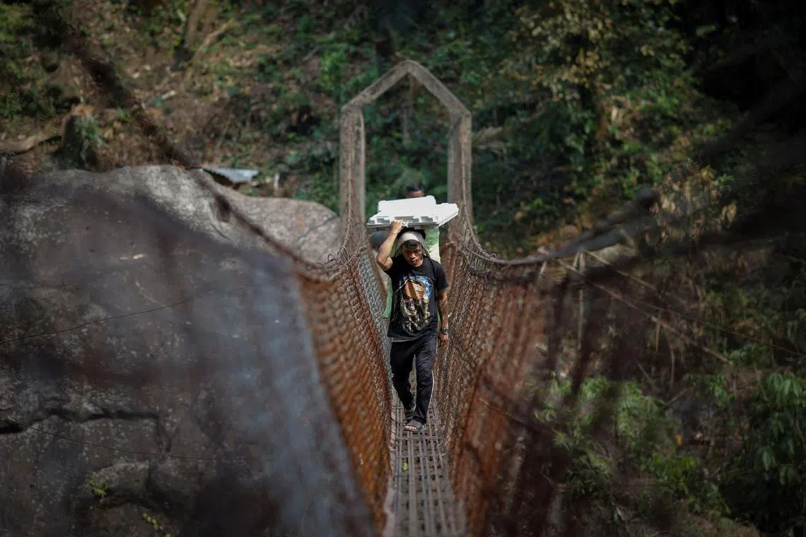 A porter, carrying voter verifiable paper audit trail and electronic voting machines, crossing a suspension bridge to reach a remote polling station in Shillong, in India’s north-eastern state of Meghalaya, on April 17.