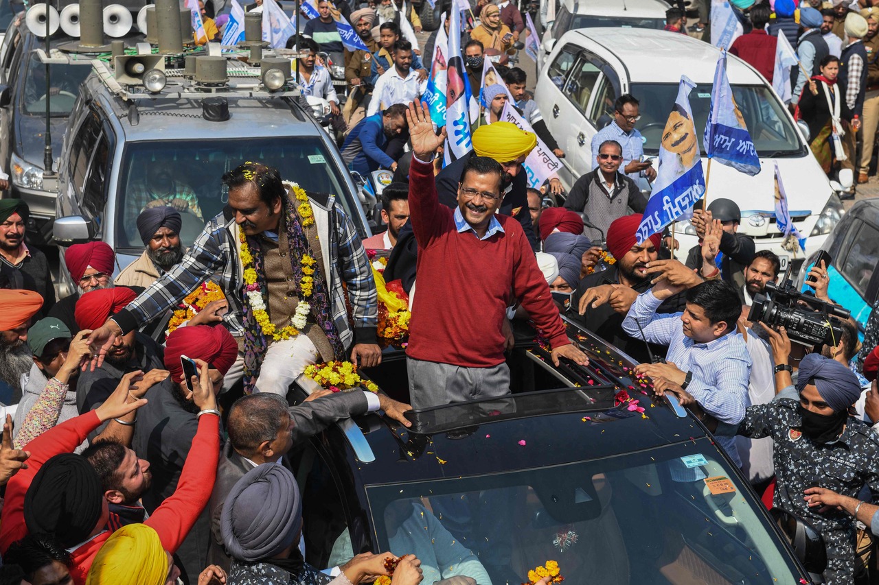The Aam Aadmi Party (AAP), led by Delhi Chief Minister Arvind Kejriwal, was leading in 91 out of 117 seats in the northern state and looked set to beat the state's incumbent Congress party, the BJP and a regional party by a wide margin, according to Election Commission data.