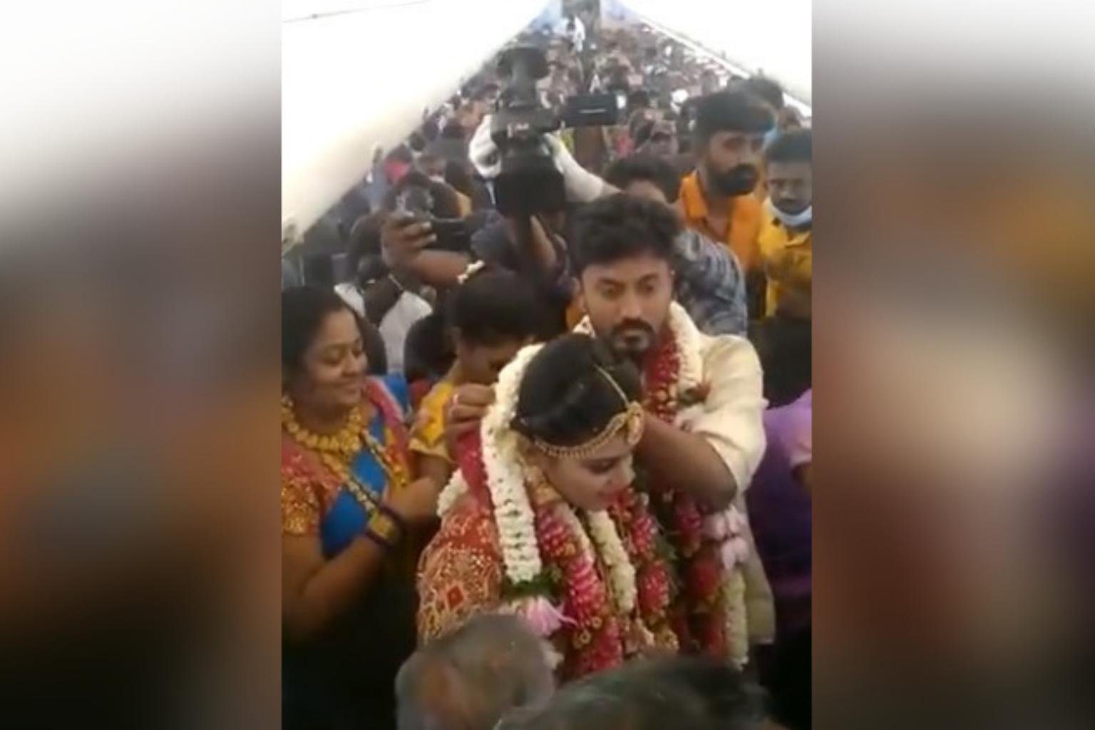 The couple, who have not been named, were married as the Spicejet plane flew over the historic Meenakshi Amman temple on its way from Madurai to Bangalore, the Hindustan Times newspaper said.