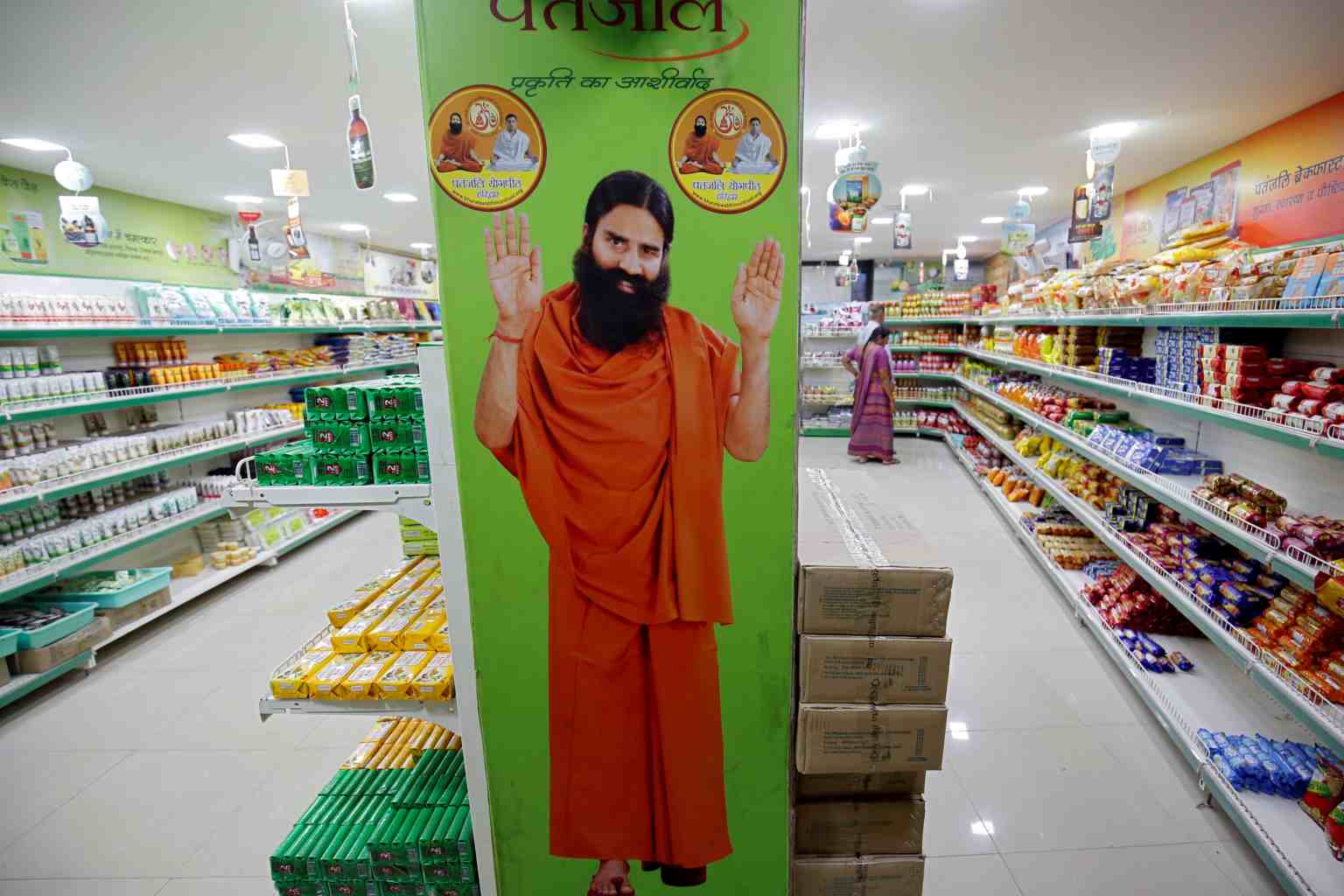 In a file photo taken on March 28, 2019, a poster of Indian guru Baba Ramdev is seen inside a Patanjali store in Ahmedabad, India.