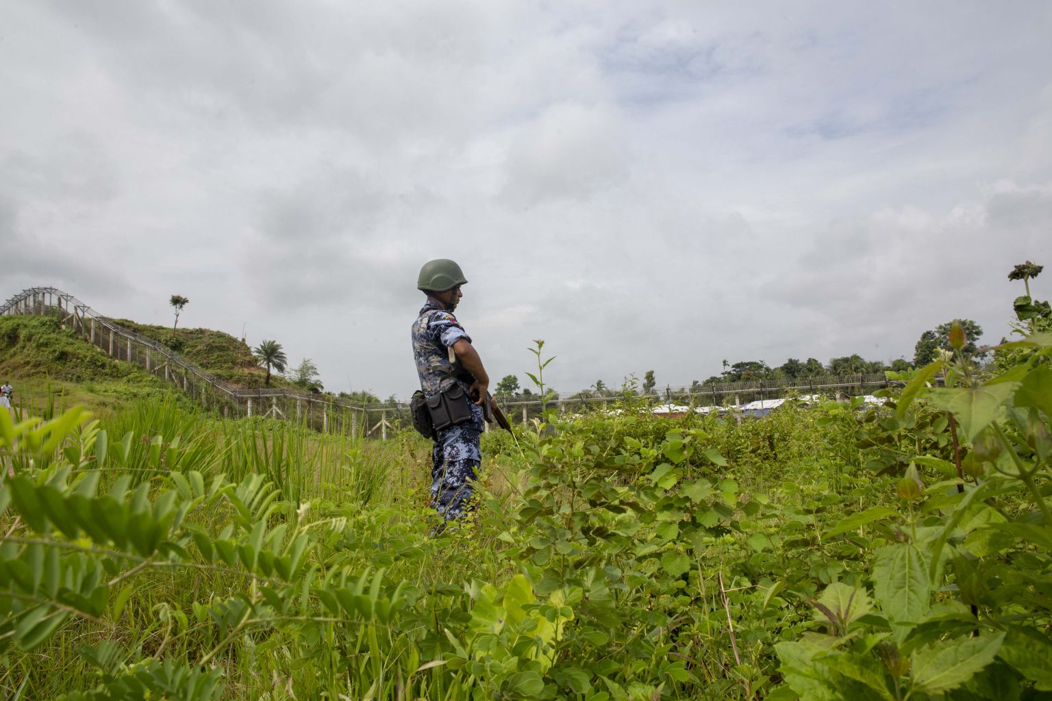 A Myanmar border guard police patrolling the fence in the "no man's land" zone between the Myanmar and Bangladesh border on Aug 24, 2018.