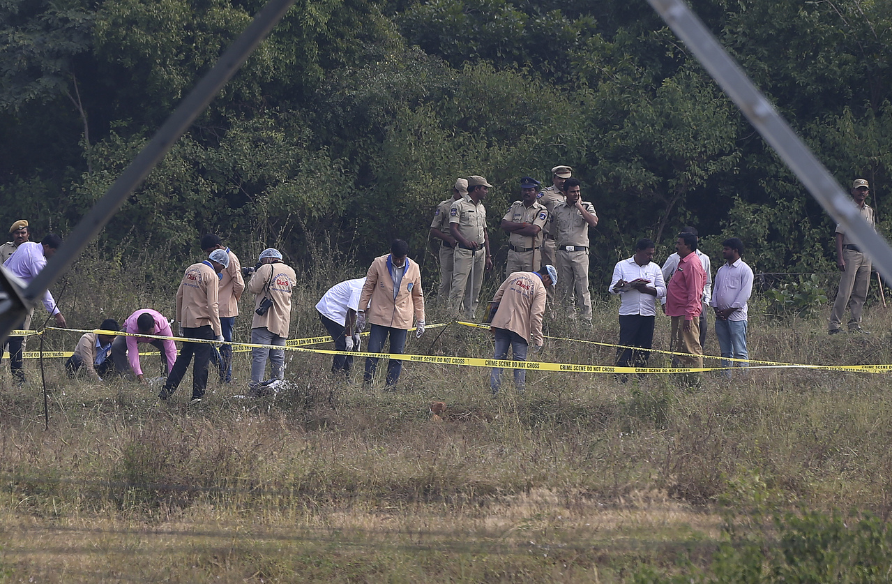 Indian policemen and forensic experts at the site where four men, suspected of raping and killing a woman, were killed, in Shadnagar on Dec 6, 2019.